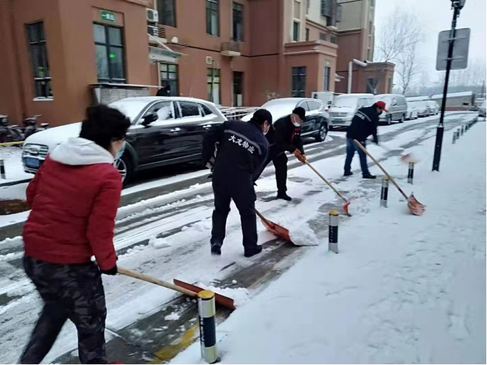 疫情就是命令,雪情同样也是命令。疫情之下,大雪之中,大龙控股所属大龙物业人始终奋战在一线,用看见的“温度”守护、温暖着全体业主。一是抗击疫情不放松。为了保障业主生命健康安全,尽管是在这大雪纷飞的日子里,大龙物业人也没有丝毫放松,不断强化疫情防控部署,认真开展公共区域消杀,严格小区出入人员的测温、登记等工作。二是铲冰除雪保出行。持续两天的大雪,让整个顺义变得银装素裹。伴随着凛冽的寒风,冰点以下的气温,大龙物业人全力以赴,以饱满的工作热情,有条不紊的清扫着小区路面的积雪,对易结冰区域科学合理使用融雪剂,防止道路结冰。有的业主看到物业服务人员持续工作深受感动,自愿加入扫雪队伍,贡献自己一份力量。三是服务业主暖人心。疫情阻挡不了物业人的真情,雪情阻挡不了物业人的热情。在做好铲冰扫雪工作的同时,物业公司针对疫情要求所有职工在扫雪铲冰过程中一定注意个人防护,不扎堆,佩戴好口罩,确保小区环境整洁,居民健康安全出行。大龙物业人勇战风雪,勇抗疫情,时刻坚守在一线,用点滴行动给这个冬天增添暖意。