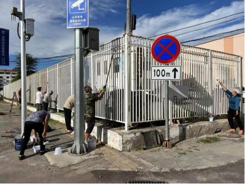 天房公司开展道路及护栏周围杂草清除、护栏刷新、清理道路小广告等工作,全力优化展馆外围环境卫生。