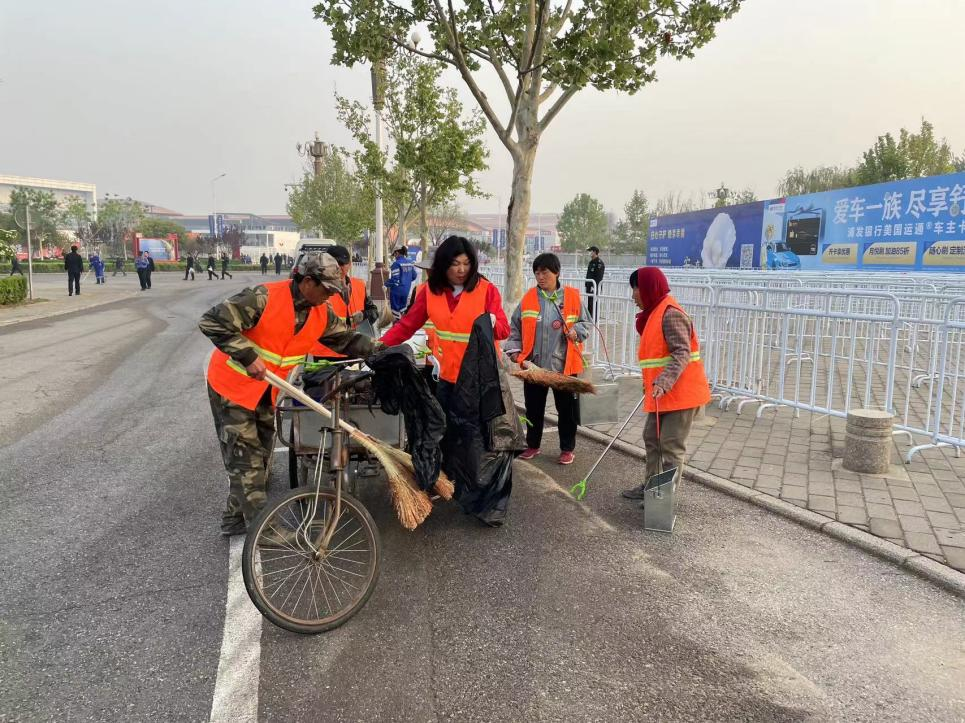 居利美保洁公司共出动664人次,对国展裕丰路、裕东路、安华街、天北路、安毓街、裕安路南段的清扫捡拾、绿化带行人步道上的白色垃圾烟头枯枝树叶和垃圾桶的清掏工作。展会期间共清扫道路及人行步道约280万平米,捡拾绿化带约152万平米,清掏垃圾桶共计768个;出动垃圾清运车3辆,共清运垃圾约128立方;出动洒水车1辆,共洒水约144立方,清扫车2辆。清扫车等每日零点开始上路作业,在国展周边主要道路进行循环清扫。